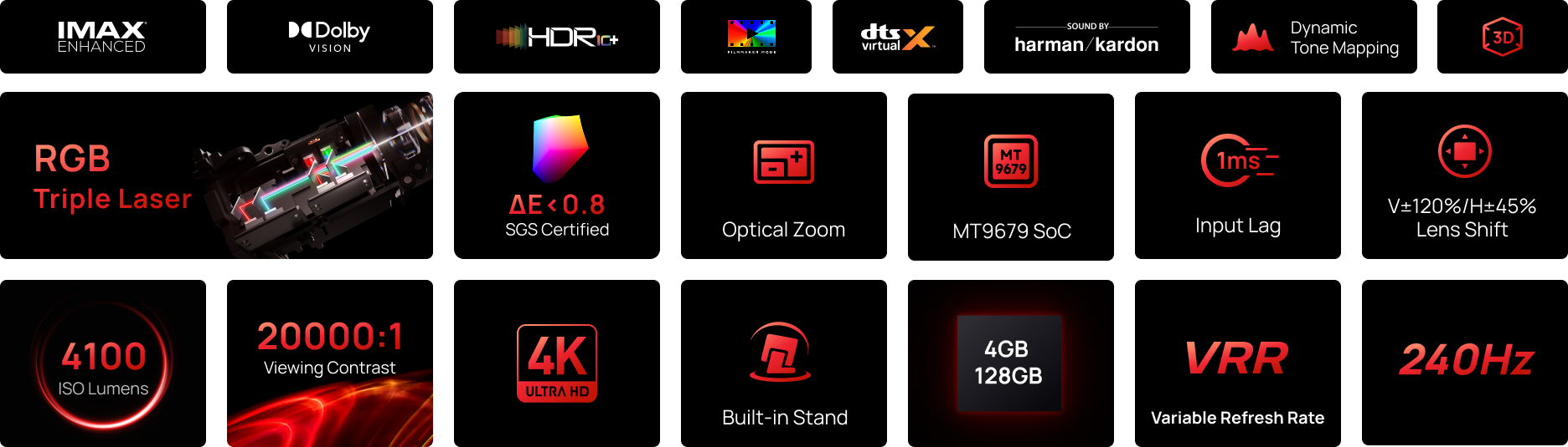 - RGB Triple Laser Brilliance: Dive into color-rich, lifelike visuals with the X-Master RGB triple laser engine. 4100 ISO lumens of brightness and ultra-deep 20,000:1 contrast bring unmatched vibrancy and depth to every scene—day or night.